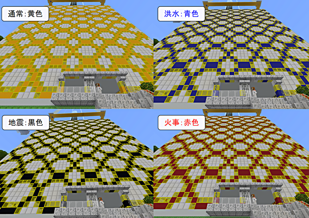 普段は黄色いコンクリートブロックの壁ですが、コマンドブロックのボタンを押すと、火事は赤、洪水は青、地震は黒のコンクリートブロックに変わって、壁の色が変わります。