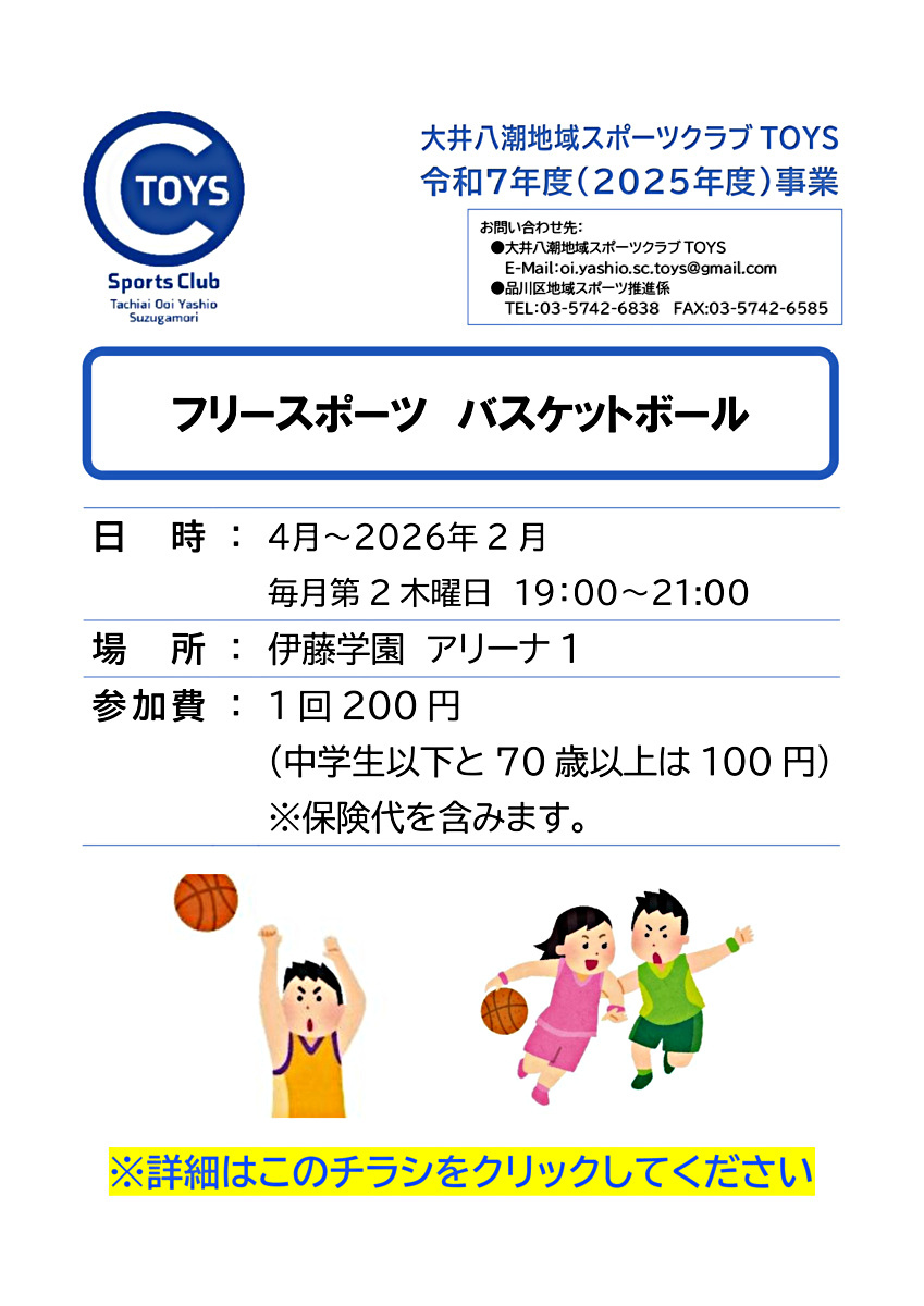 ■持ち物:室内用運動靴(体育館履きなど)、汗拭きタオル、飲み物、ボール