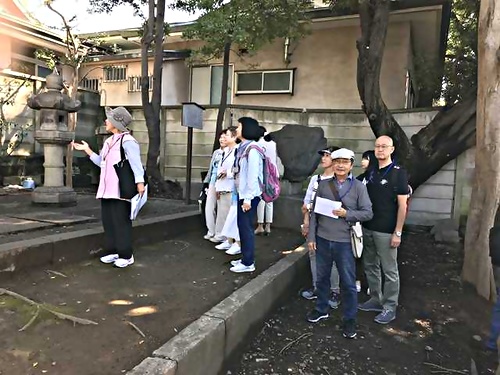 1-5)9月13日(木曜日)、中村さん、堀江さんが「生きがい大学史跡巡りクラブ(春日部学園)の方、14名を品川三宿コースで案内しました。(写真参照)