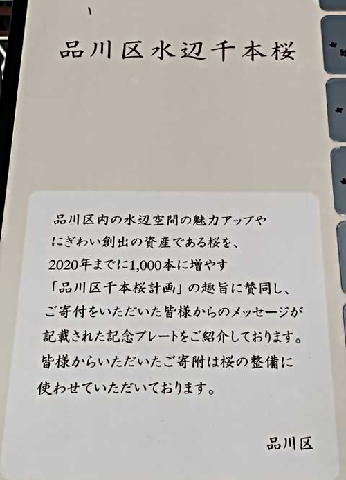 品川橋中央にある「品川区水辺千本桜」寄付者一覧