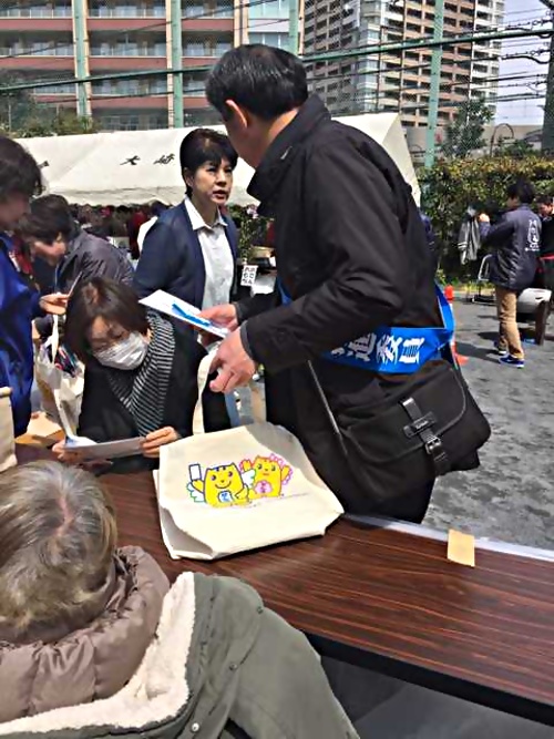 前日の雨天とは違い、当日は穏やかな絶好のお花見日和。多くのお年寄りや家族連れが集まる、大崎三五町会主催の桜祭りで、選挙の啓発をしました。