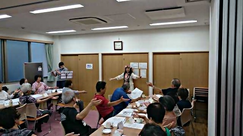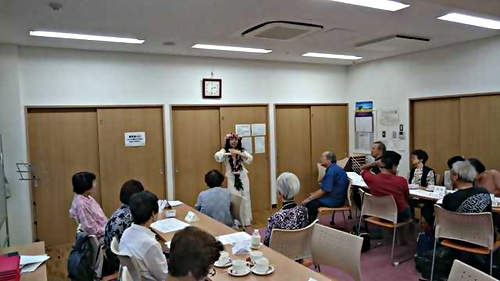 ミニカルチャーは『みんなでフラダンス!」と題して、三橋さんのフラダンスを観ながらハワイアンを皆で歌い、一緒にダンスも楽しみました。「南国の夜」「アロハウェイ」と進み「見上げてごらん夜の星を」では、ハワイアン調のフルート伴奏も加わり、ダンスに花を添えました。
