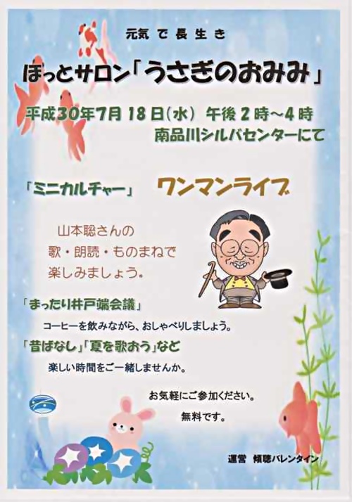 次回のほっとさろん「うさぎのおみみ」は7月18日(水)午後2時~、南品川シルバーセンターにて、参加費無料で行います。