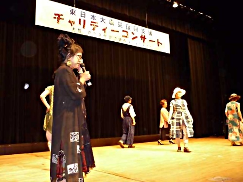 チャリティーコンサートでは、着物リメイクファッションショーが行われ、会場から盛んな拍手が送られました。マイクを握るのは、菊池裕子さん。