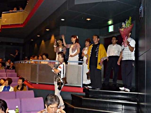 チャリティーコンサートには、各界を代表する歌手、漫才師の皆さんが参加。演壇に向かってエールを送る参加者たち。