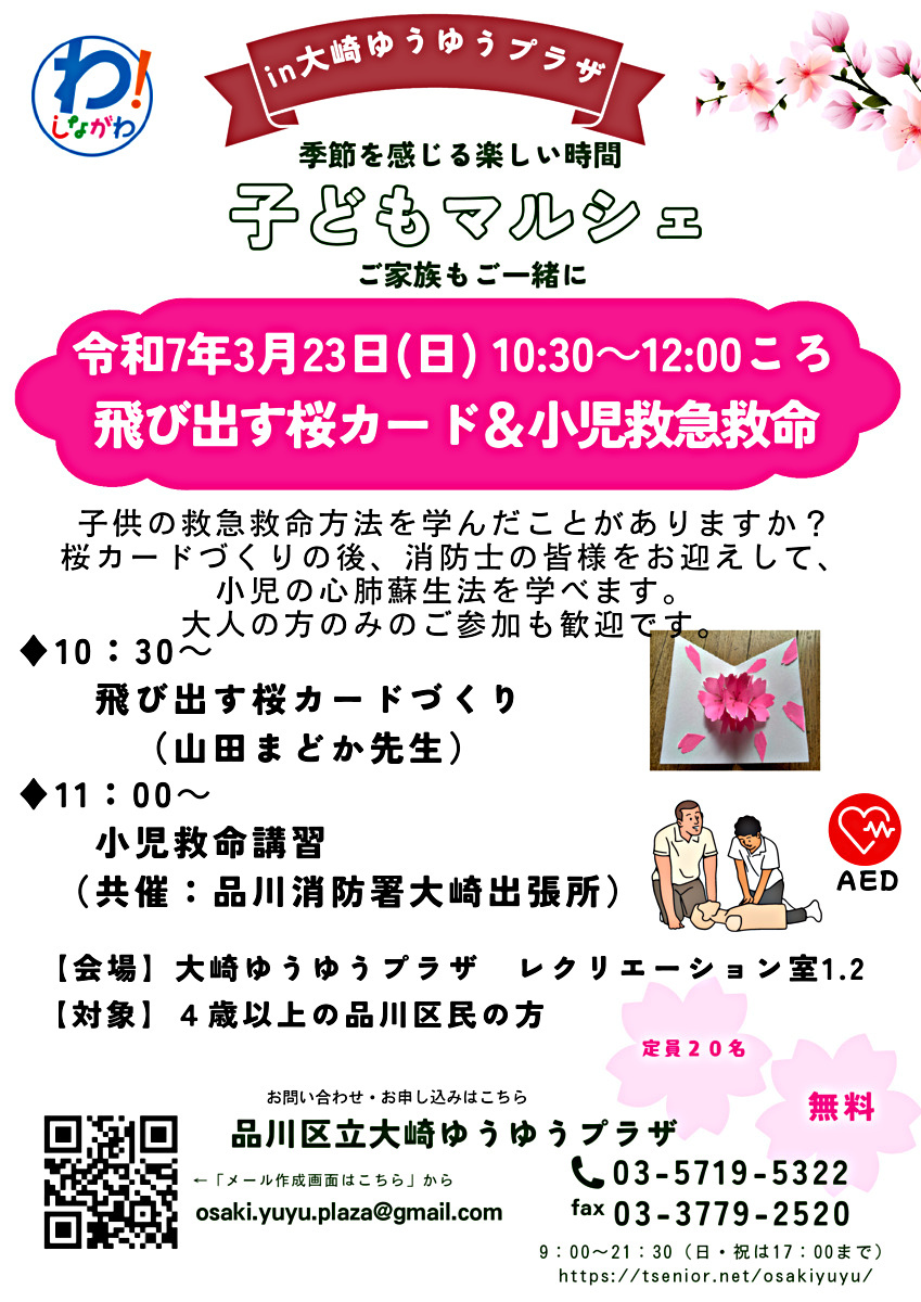 大崎ゆうゆうプラザにて、イベントを開催いたします。前半は工作で、桜のカードを作ります。後半は、品川傷病所大崎出張所の方々がいらっしゃり、乳児・小学生・大人の人形を用いた救急救命講座を行います。特に子供の救急救命は珍しい講座です。いざというときの命を守る講座、ぜひご検討ください。