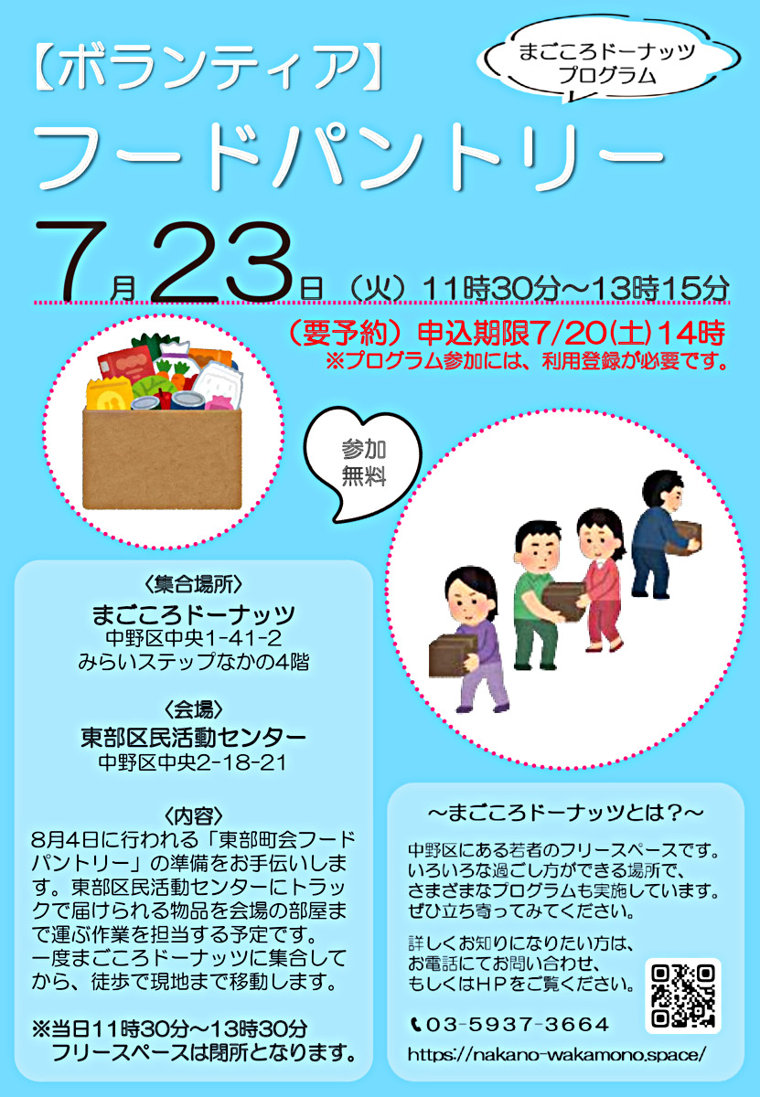 中野区若者フリースペース(中野区委託事業)まごころドーナッツのボランティアプログラムです。