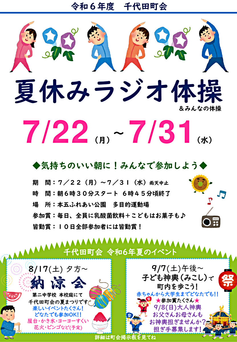 町会会員以外の方の参加ももちろんOKです。千代田町会は一年中ラジオ体操をやっていますが、夏休み期間は特別⭐️毎朝、参加者全員に乳酸菌飲料が配られます。こどもにはさらにおやつのプレゼントも(毎日です!!)⭐️