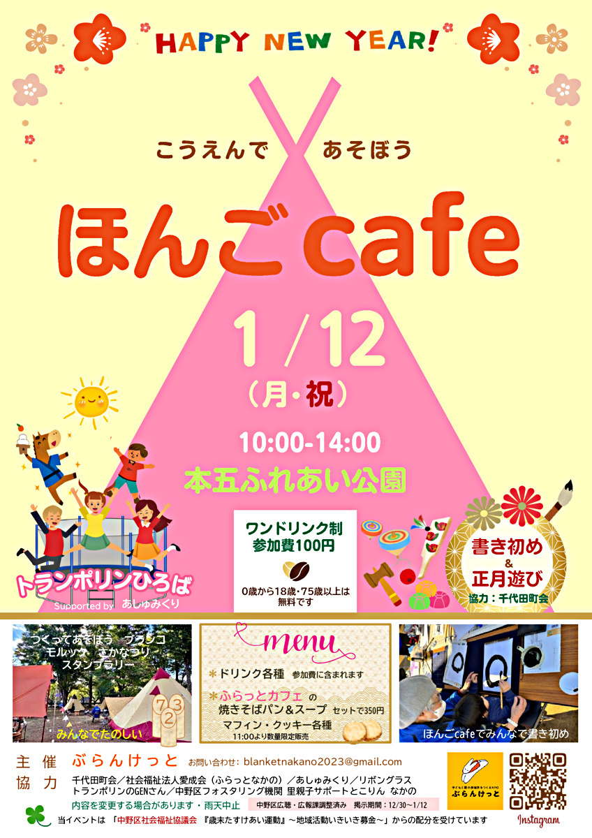 『ほんごcafe』@本五ふれあい公園 1月12日(月祝)開催☕️大きなトランポリンで思い切りからだを動かそう!! コーヒー代(参加費)大人のみ100円。こどもは全部のアクティビティを無料であそべます!「書き初め体験」「お正月遊びコーナー」「工作ワークショップ」「宝さがし」「モルック」もあるよ。