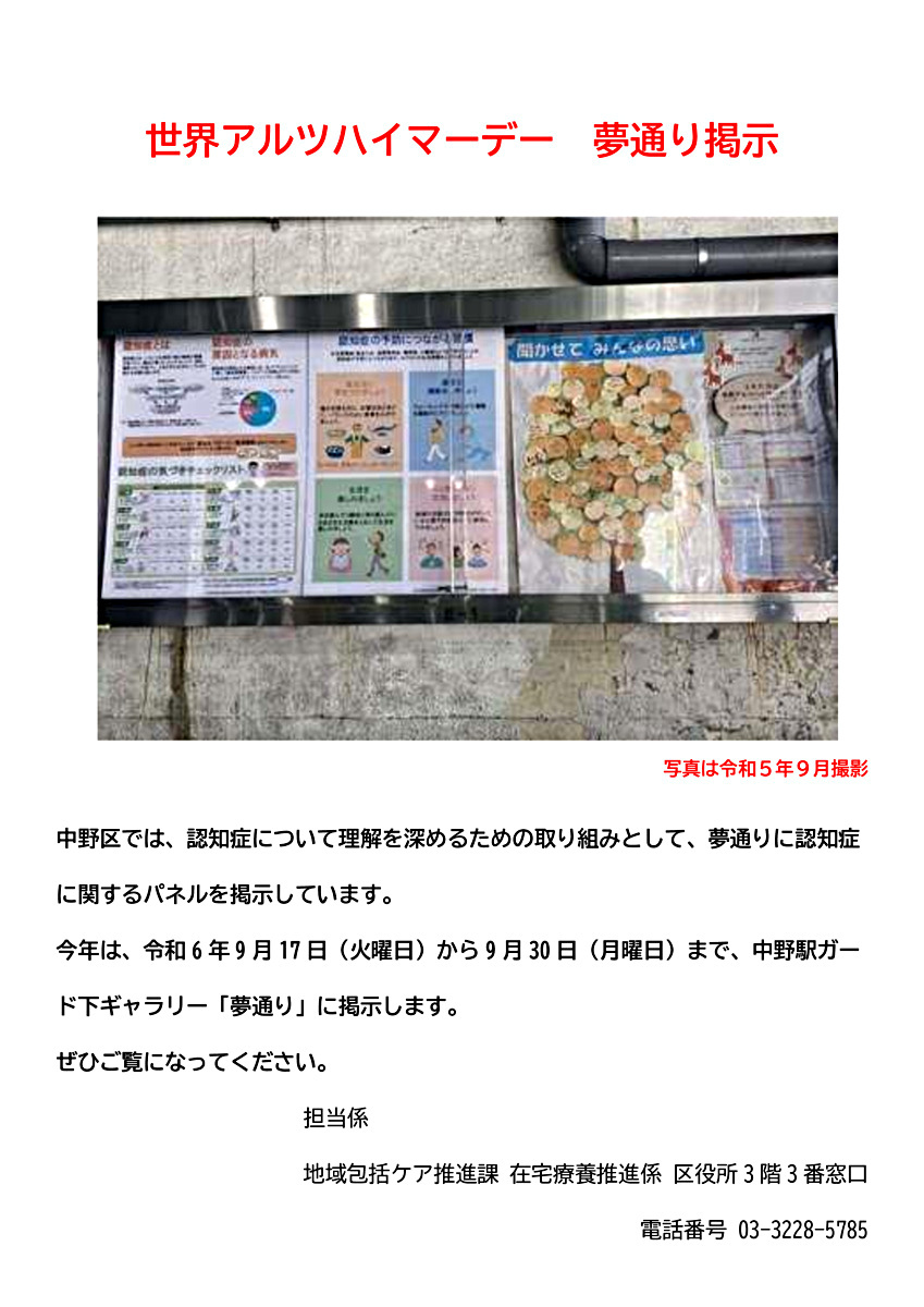 中野区では、認知症について理解を深めるための取り組みとして、認知症に関するパネルを令和6年9月17日(火曜日)から9月30日(月曜日)まで、中野駅ガード下ギャラリー「夢通り」に掲示します。