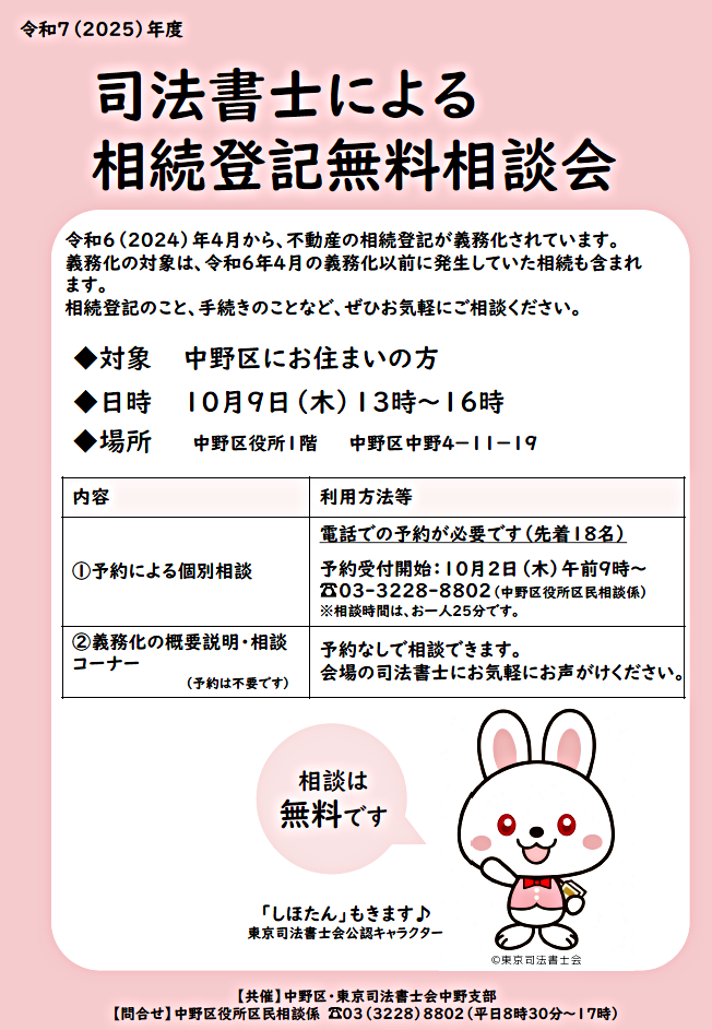 東京司法書士会中野支部と中野区とが共催で実施する相談会です。