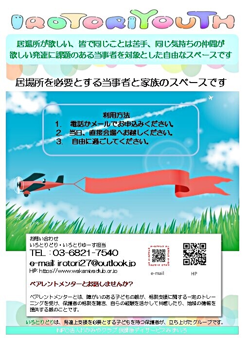 発達に課題のある若者と家族の居場所です。診断の有無は問いません。ペアレントメンターが随時参加しています。子育てに関する悩みのご相談もできます。