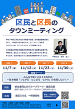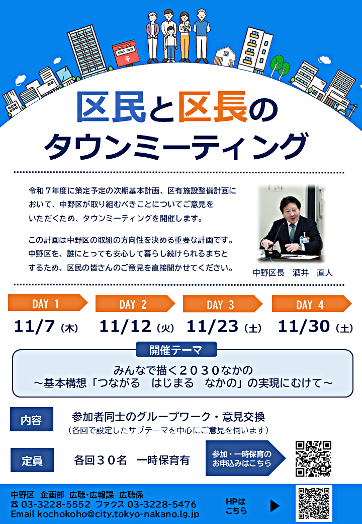 中野区は、中野のまちをより良いものとしていくため、区民の皆さんと区長の対話の場として「区民と区長のタウンミーティング」を開催しています。