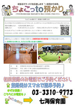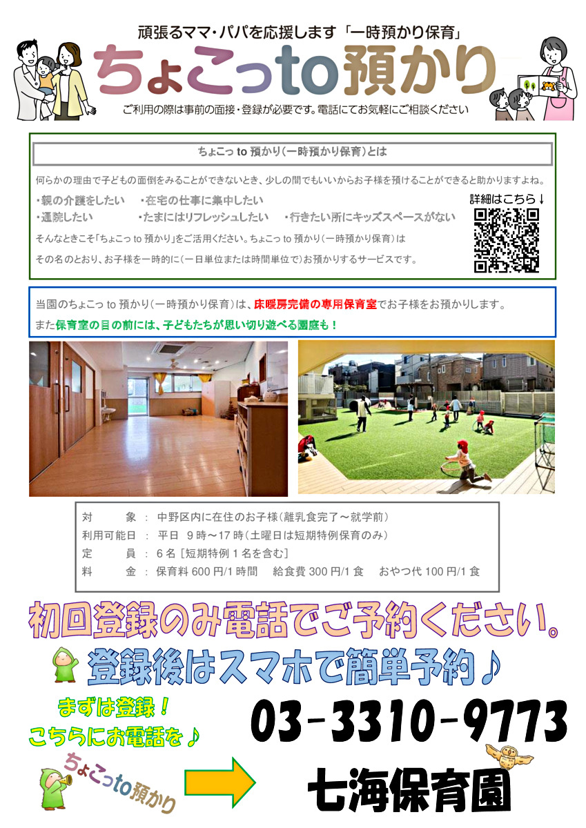 安心の認可保育園、社会福祉法人での一時預かり保育です。少しだけ預かって欲しいというニーズに応えて、どの時間からでも、1時間単位でお預かりします。中野区事業のため、1時間600円、給食は300円という安価でご利用できます。利用の制限は無く、空きがあればいつでも何度でもお預けできます。また、利用に理由は必要ありません。友人とのリフレッシュ、ご自身の病院やお仕事、何でも大丈夫です。