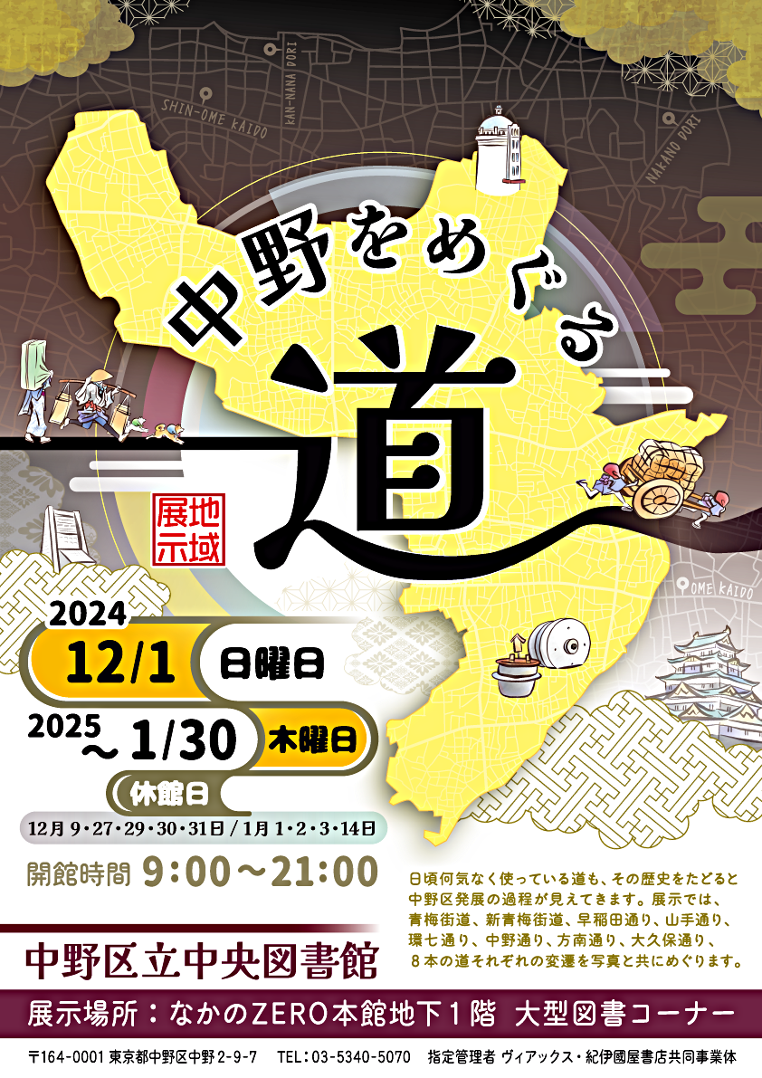 展示では、青梅街道、新青梅街道、早稲田通り、山手通り、環七通り、中野通り、方南通り、大久保通り、8本の道それぞれの変遷を写真と共にめぐります。