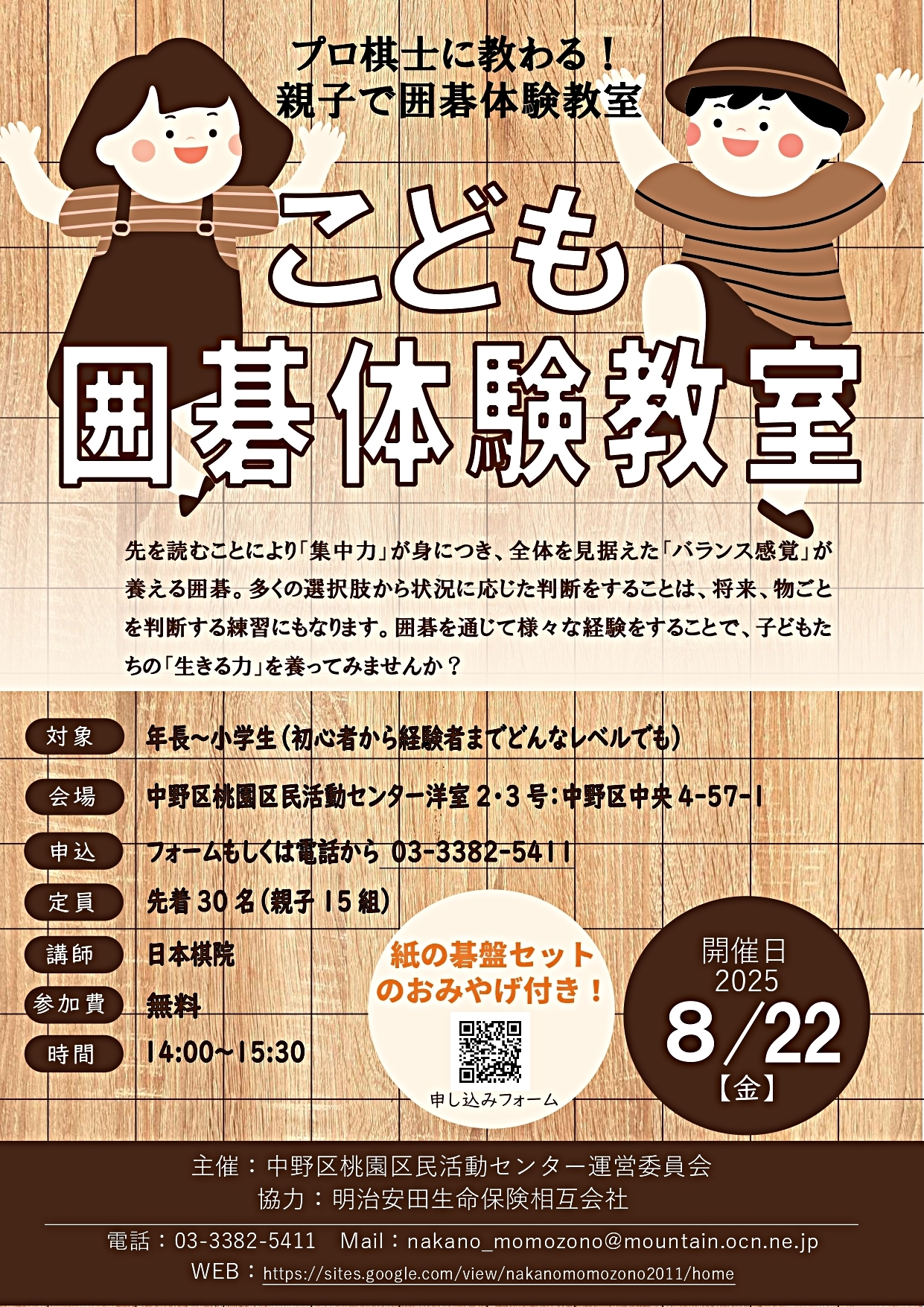 先を読むことにより「集中力が身につき、全体を見据えた「バランス感覚」が養える囲碁。多くの選択肢から状況に応じた判断することは、将来、物事を判断する練習にもなります。囲碁を通じて様々な体験をすることで、子どもたちの「生きる力」を養ってみませんか? 残8組(先着順)