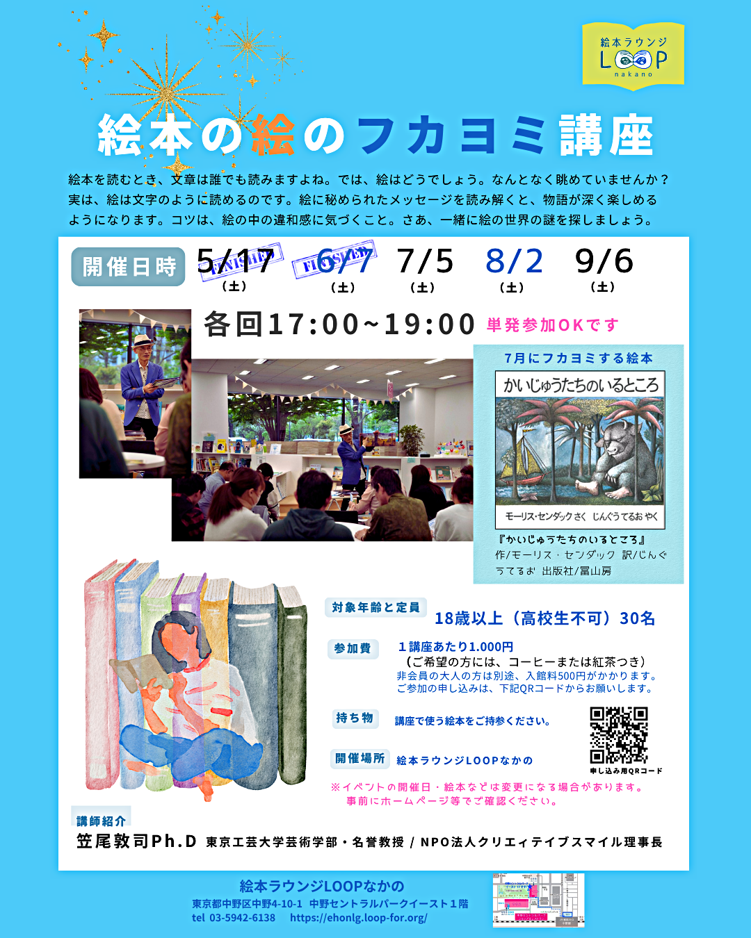 ◆持ち物:講座で使う絵本(7月は『かいじゅうたちのいるところ』)をご持参ください。