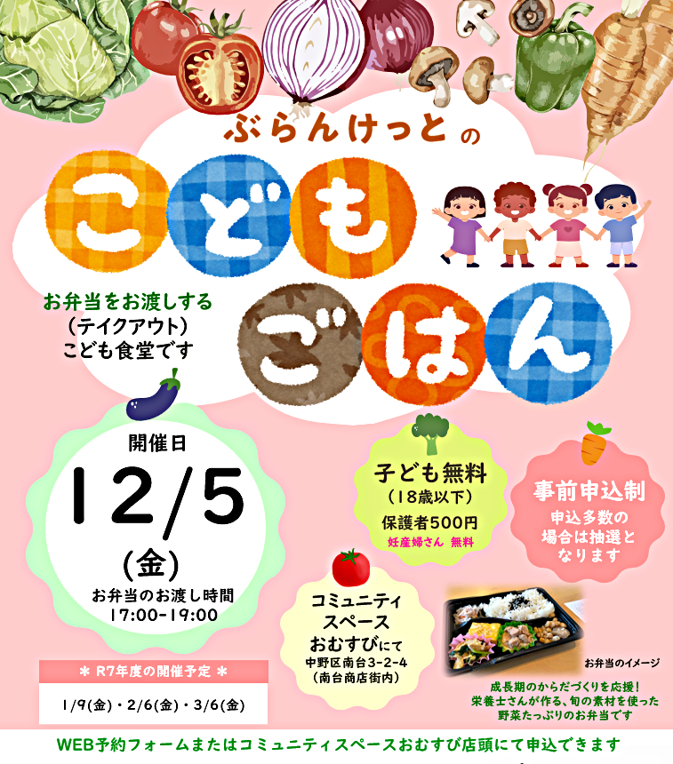 【受付終了】ぶらんけっとのこどもごはん(11月) *お弁当配布*事前申込制/優先枠あり/ 抽選 / 500円/こども・妊産婦さんは無料提供
