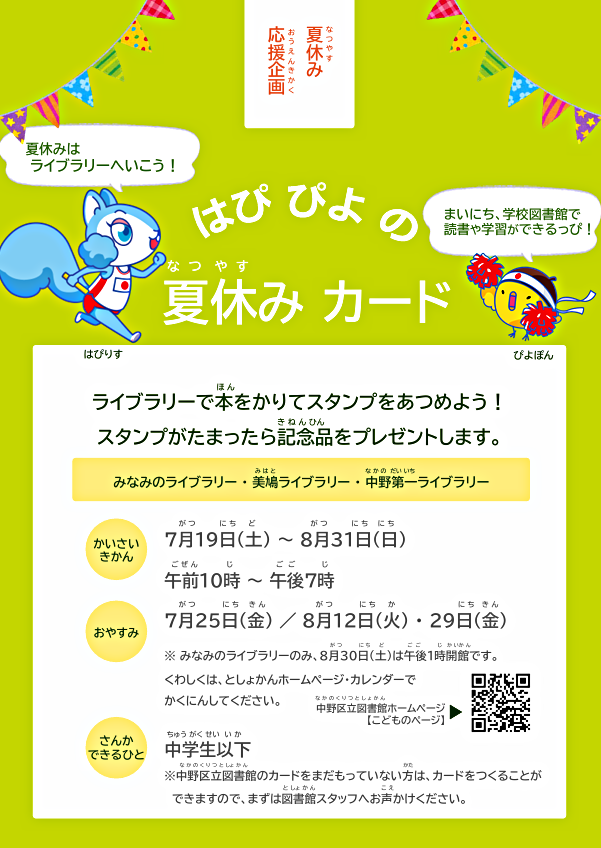 ライブラリーは7月25日(金曜日)、8月12日(火曜日)、29日(金曜日)がお休みです。くわしくは、としょかんホームページ・カレンダーでかくにんしてください。