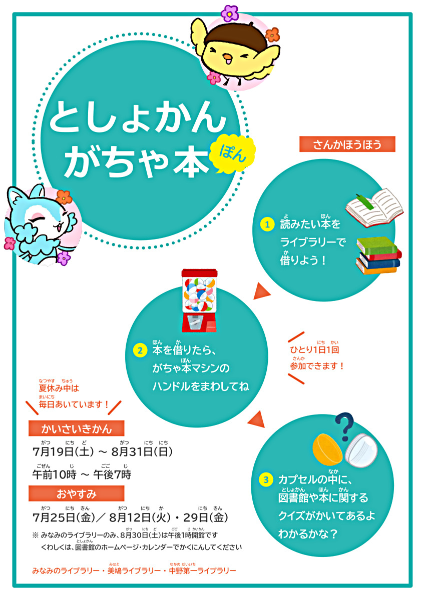 ライブラリーで貸出をすると、がちゃ本マシンを1回まわすことができるよ!