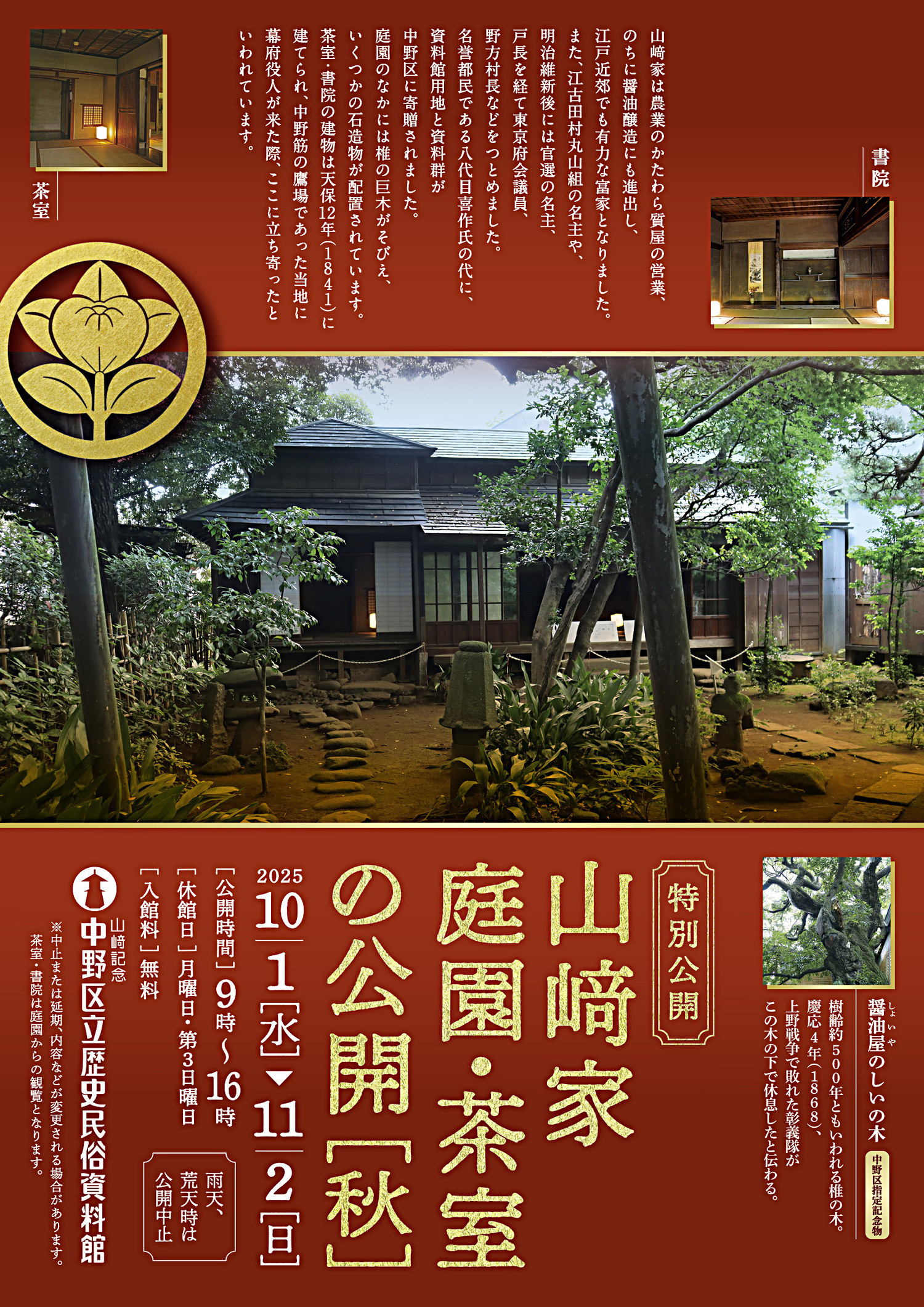 本日より11月2日(日)まで山﨑家の庭園・茶室を公開します。