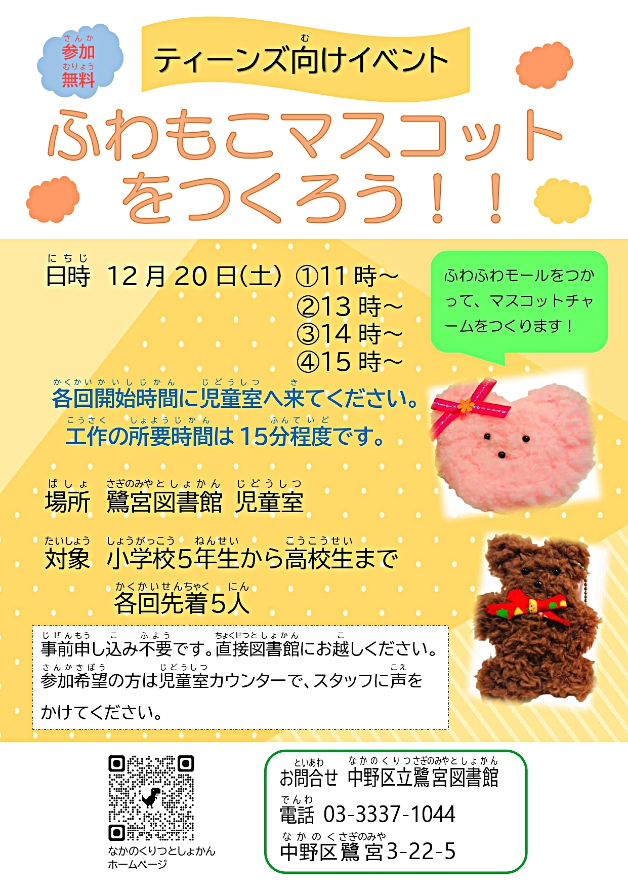 参加希望の方は各回の開始時間に鷺宮図書館の児童室へ来てください。好きな色のモールでオリジナルのマスコットチャームを作ろう!