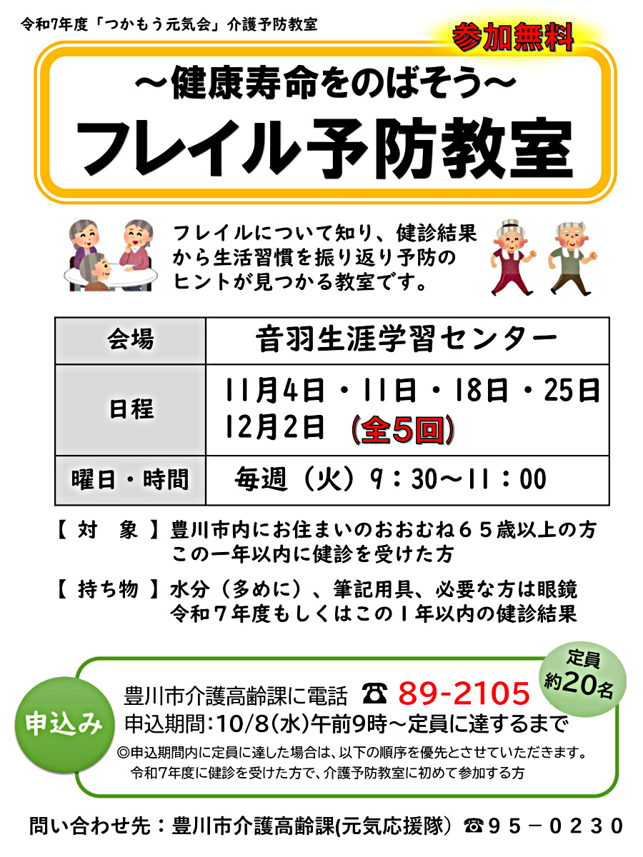 「フレイル」とは、心身が健康と要介護の間にある状態のことです。ご自身の健診結果から生活習慣を振り返り、フレイルの予防と対策を考えることを目的とした教室です。