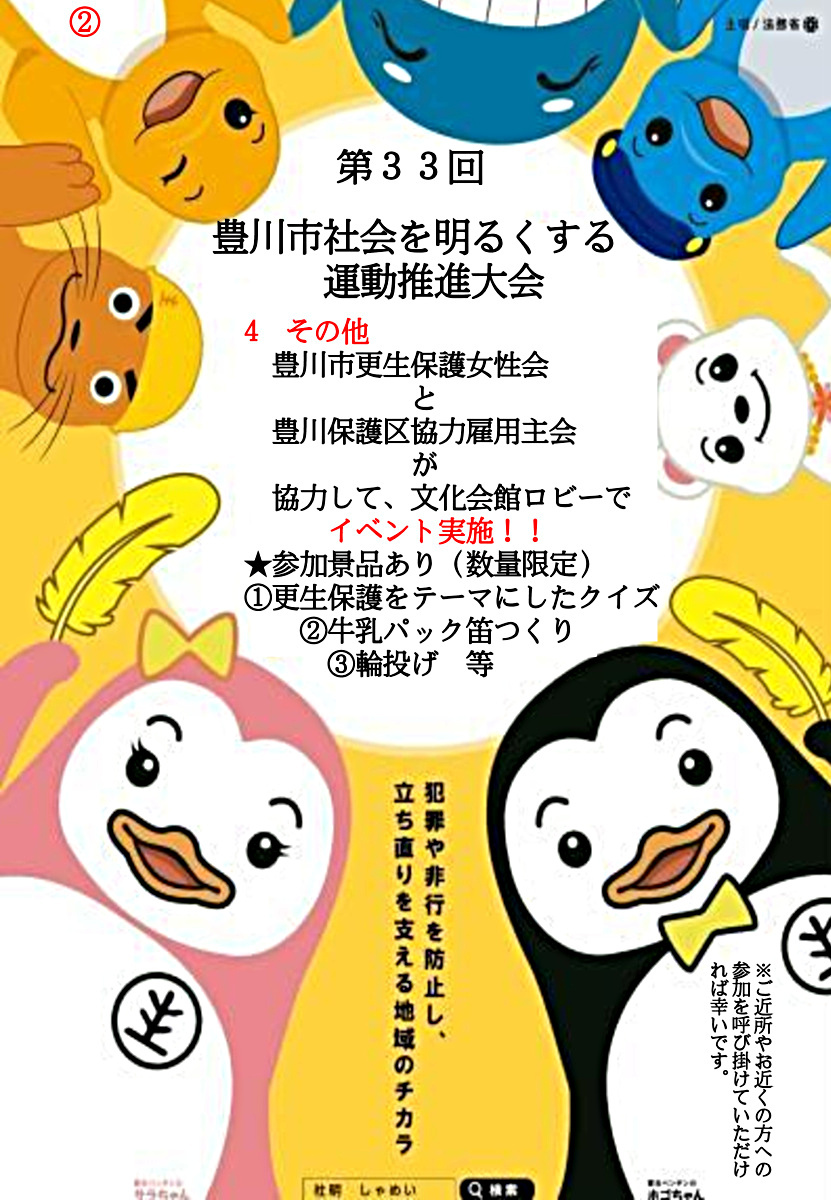 大会当日は、文化会館のロビー(ホワイエ)で豊川市更生保護女性会と豊川保護区協力雇用主会によるイベントを開催します。更生ペンギンのホゴちゃんも登場します。イベント参加者に数量限定の景品があります。
