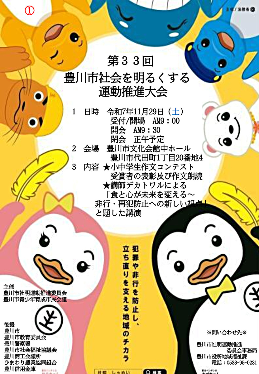 豊川市社明運動推進委員会と豊川市青少年育成市民会議では、犯罪や非行のない明るい社会を築くため、「第33回豊川市社会を明るくする運動推進大会」を開催します。