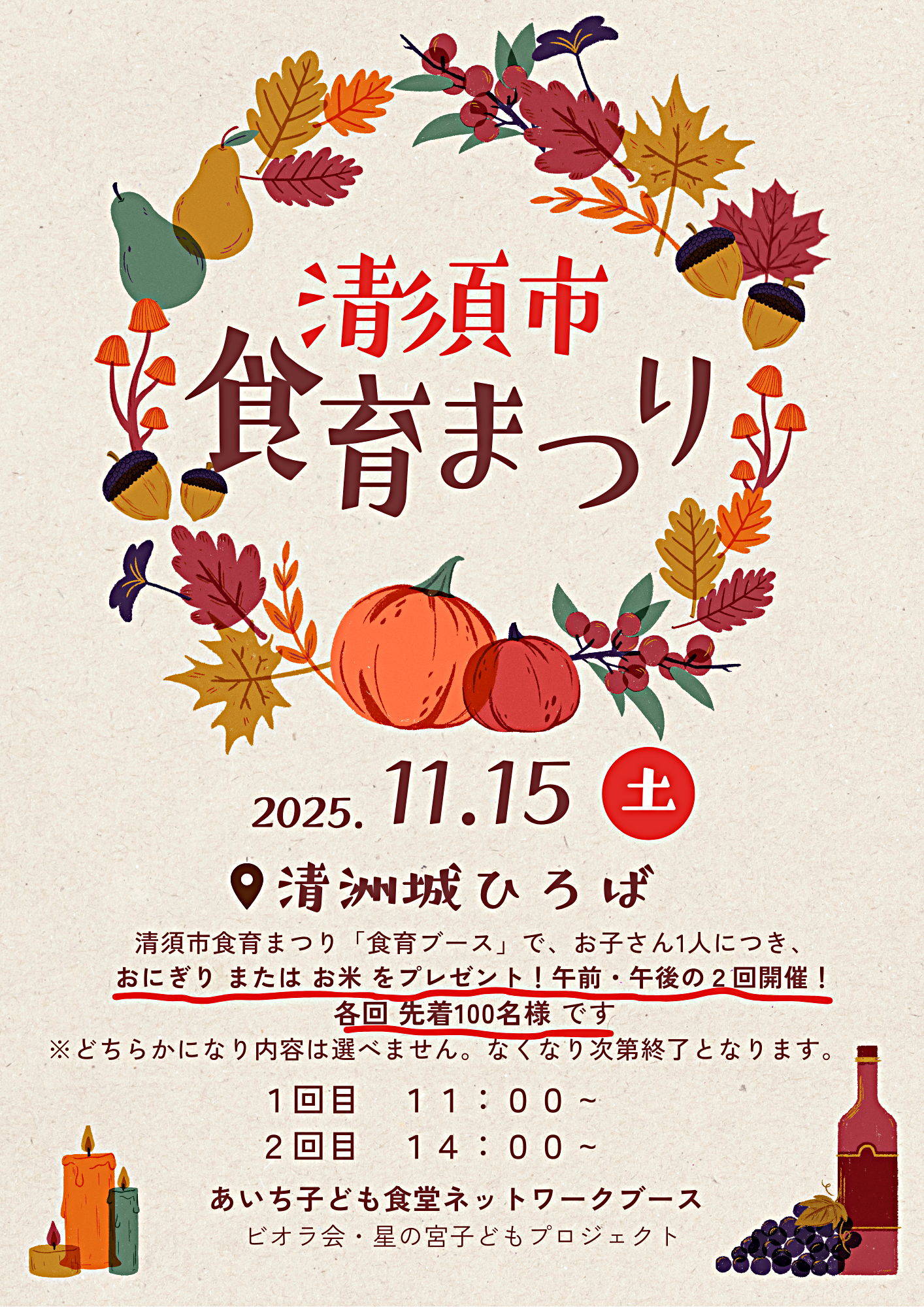 令和7年11月15日に「清須市食育まつり」が清洲城広場で開催されます。