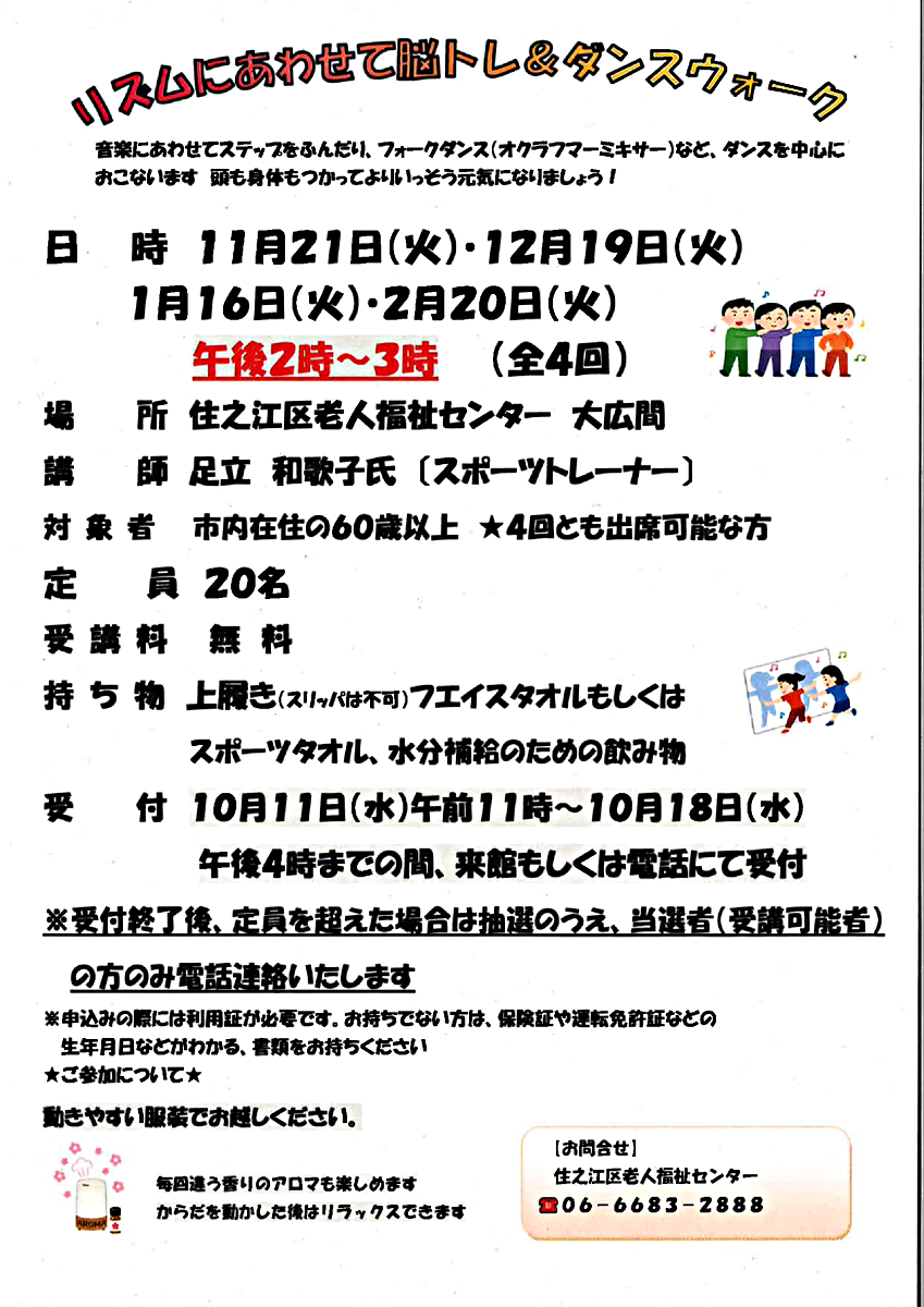 音楽にあわせてステップをふんだり、フォークダンス(オクラホマミキサー)など、ダンスを中心におこないます。頭も身体もつかってよりいっそう元気になりましょう!