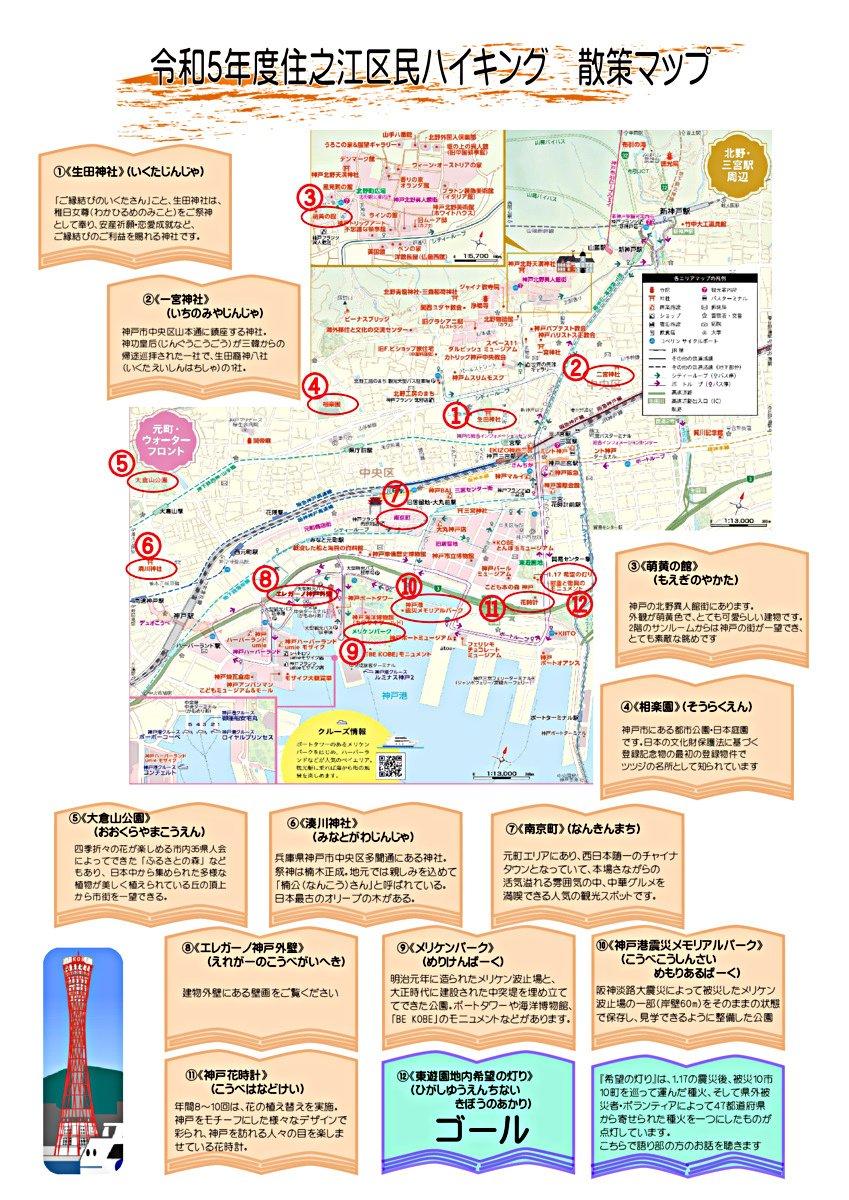 阪神淡路大震災復興モニュメントを巡り、三宮東遊園地内の希望の灯りがゴールとなっています。