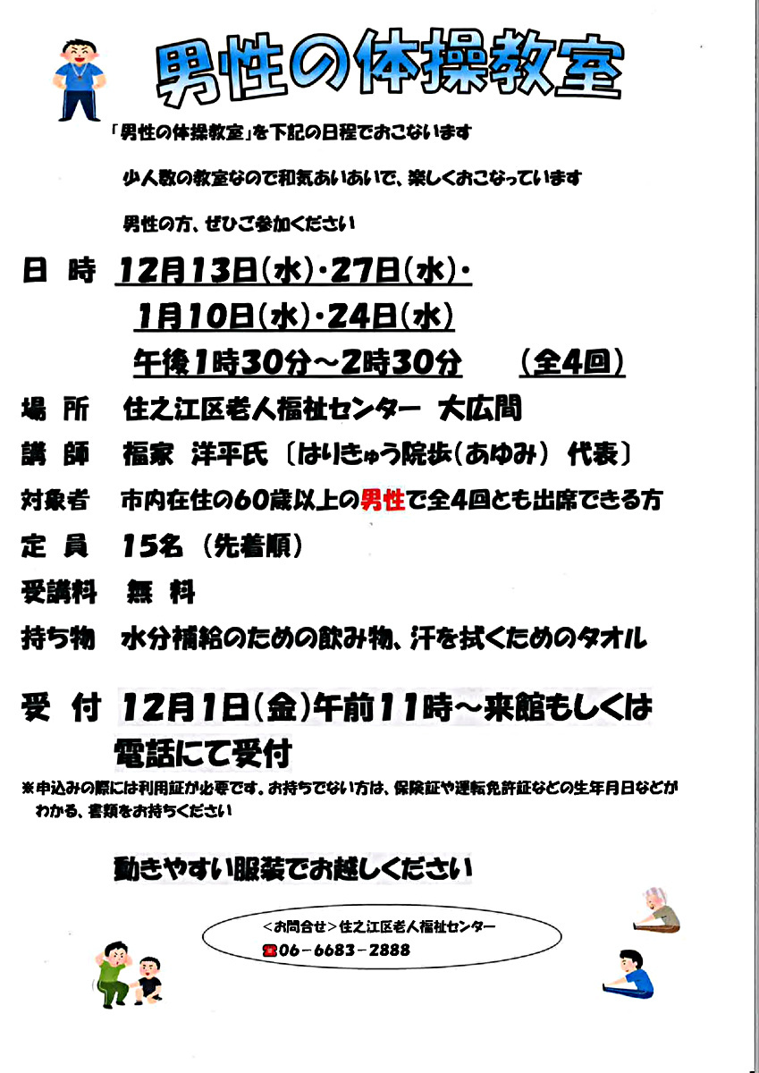「男性の体操教室」を全4回にわたって行います。少人数の教室なので和気あいあいで楽しくおこなっています。男性の方、ぜひご参加ください。