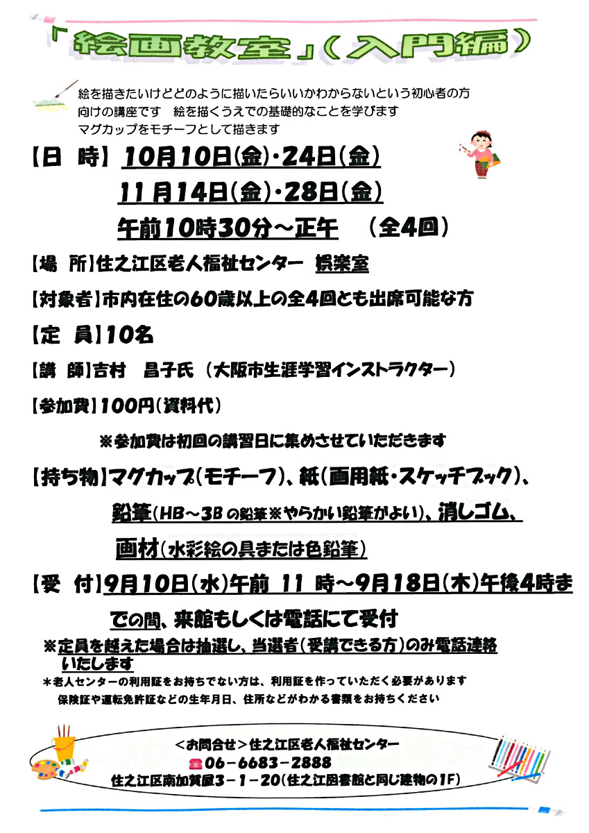 ●持ち物として、マグカップ(モチーフ)、紙(画用紙・スケッチブック)、鉛筆(HB~3Bの鉛筆※やわらかい鉛筆が良い)、消しゴム、画材(水彩絵の具または色鉛筆)
