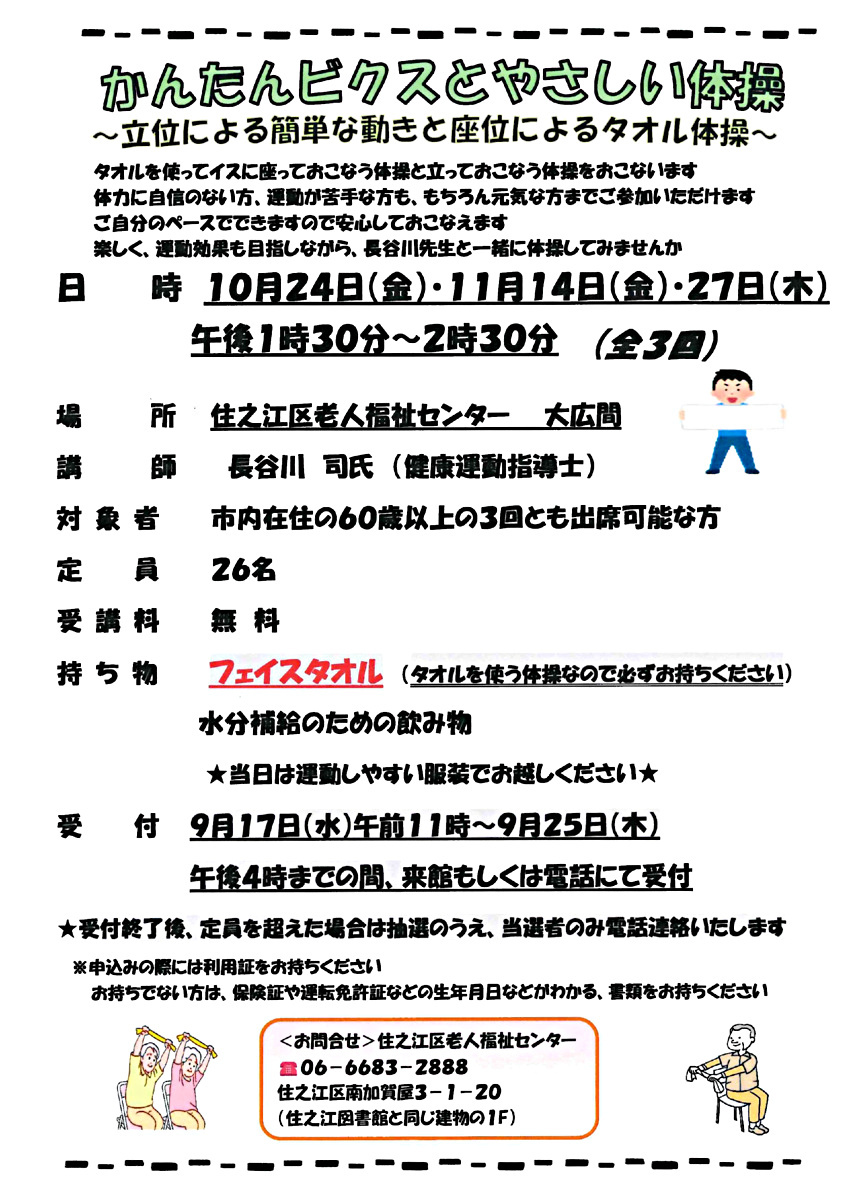 ●持ち物として、フェイスタオル(タオルを使う体操なので必ずお持ちください)