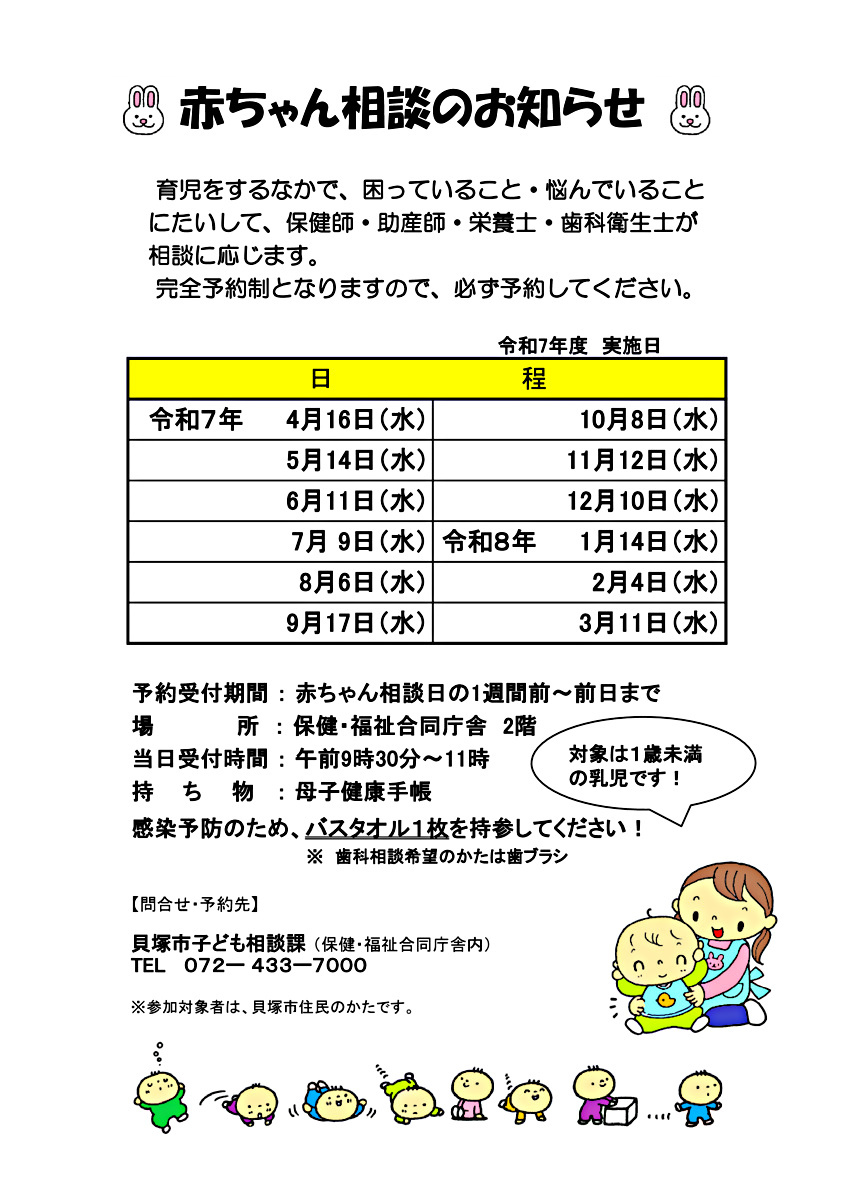 赤ちゃんを育てる中での困りごとの相談に応じます。予約は各日程の1週間前から受け付けております。