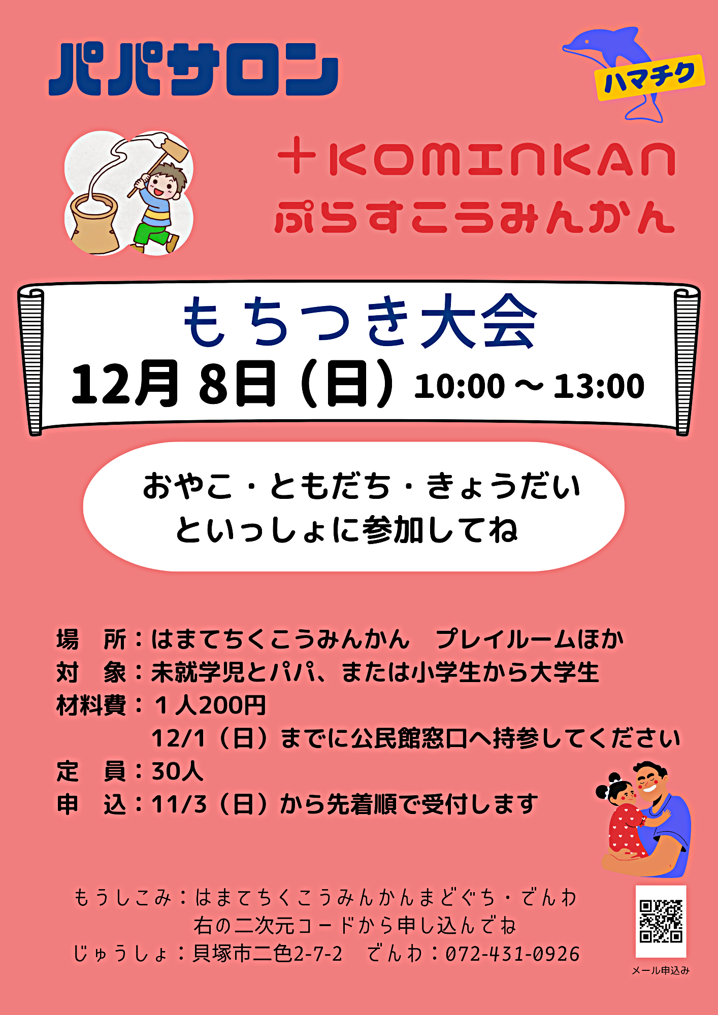 パパサロン・+KOMINKAN合同開催の「もちつき大会」です。親子・友達・きょうだいと一緒に参加してください。