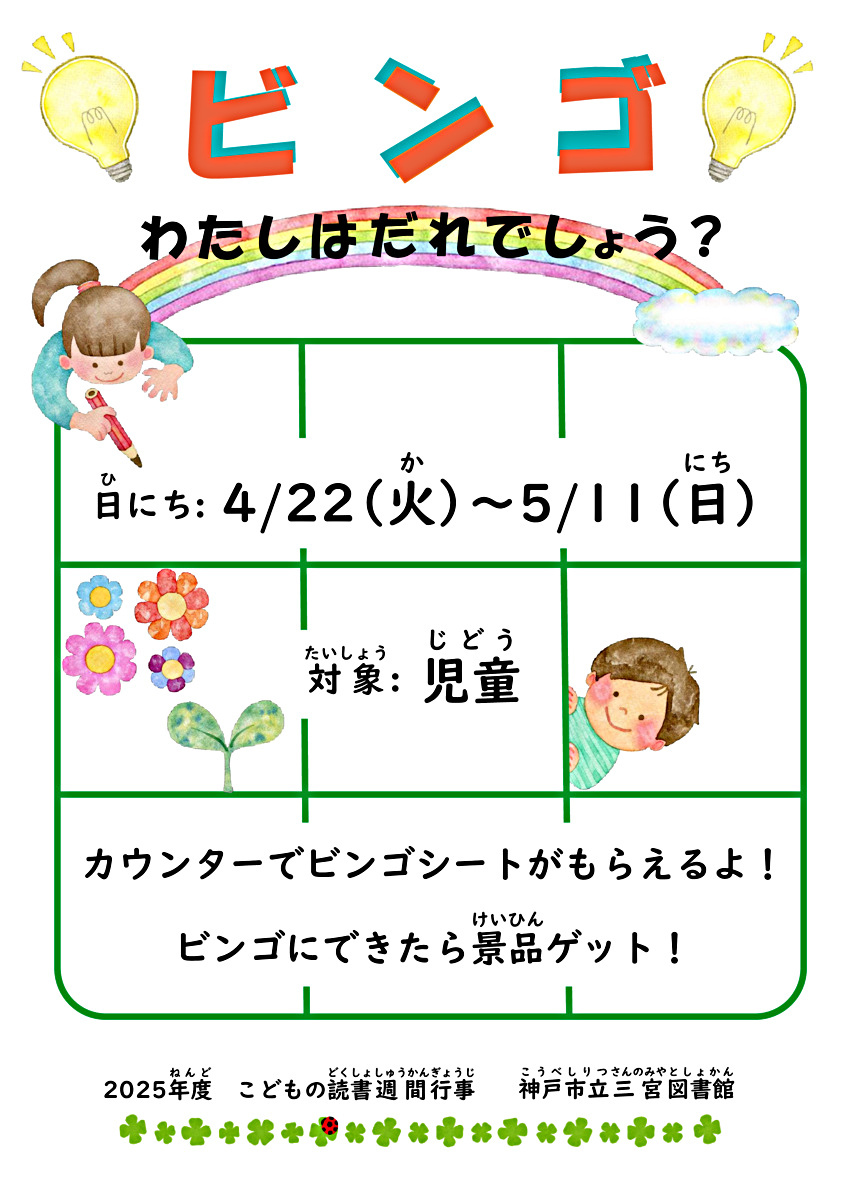 図書館のあちこちに色々なおはなしの主人公のシルエットが登場!それを見て、それが誰か当ててみよう!見事ビンゴにできた人には、プレゼントがあるよ!