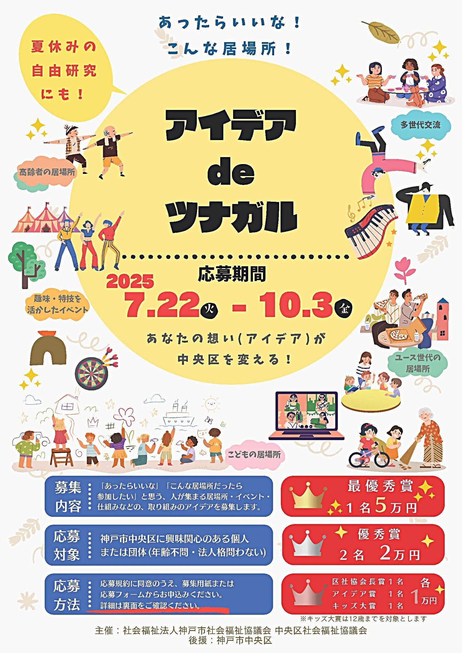 神戸市中央区内で「あったらいいな」「こんな居場所だったら参加したい」と思う、人が集まる居場所・イベント・仕組みなどの、取り組みのアイデアを募集します。