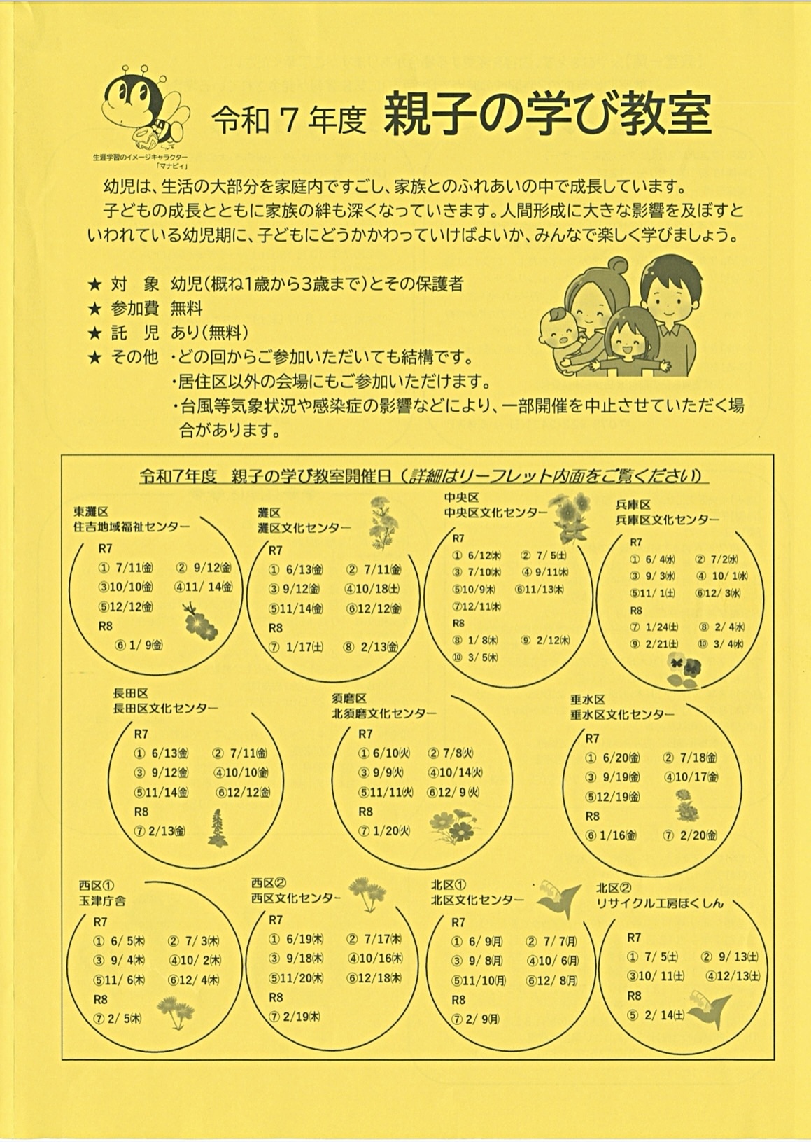 兵庫区親子の学び教室では、親子で学べる様々なプログラムをご用意しています。対象は概ね1歳から3歳までのお子さんと保護者さま。1歳未満の親子さんも是非お問い合わせくださいね。