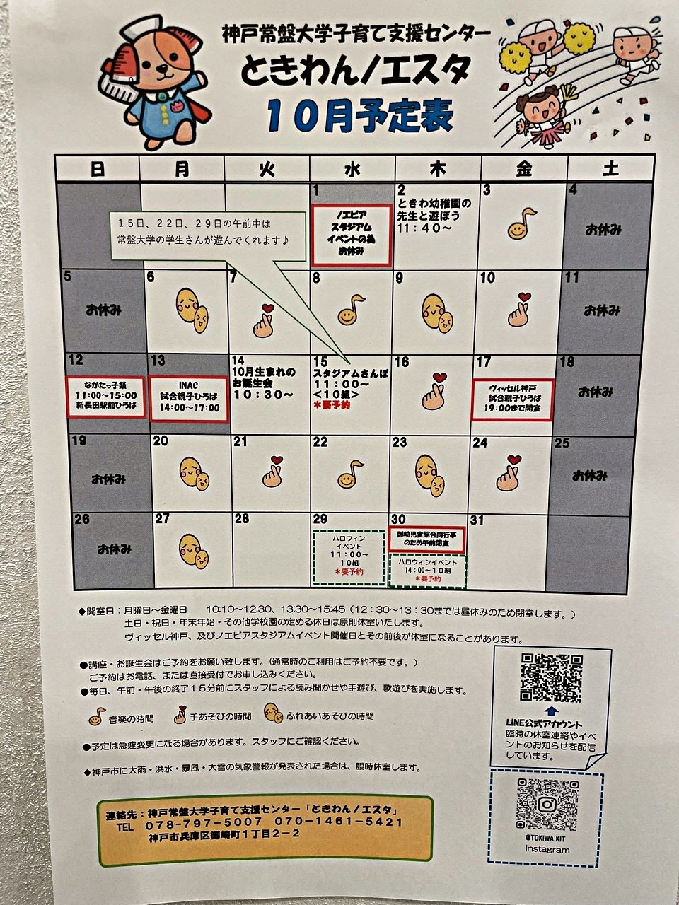 ☆15日、22日、29日は神戸常盤大学の学生が出し物をしてくれたり一緒に遊んでくれます。 ぜひお越しください。