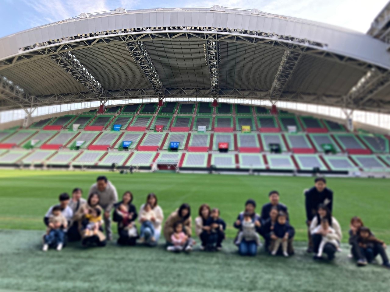 ピッチの周りをみんなでお散歩します。ベンチでお写真が撮れます。スニーカーでお越しください。(雨天中止)
