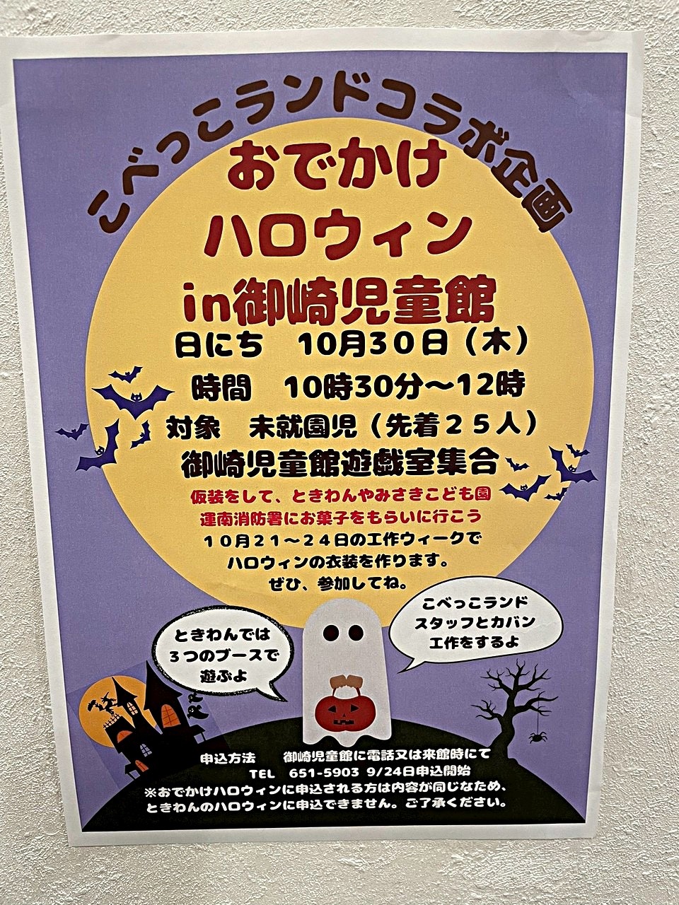 ☆おでかけハロウィンin御崎児童館 30日(木) 10:30〜12:00 仮装をしてときわんノエスタに立ち寄って、遊びます。申し込みは御崎児童館になります(078-651-5903)。 (ときわんのハロウィンイベントとどちらかの参加になります🙏)