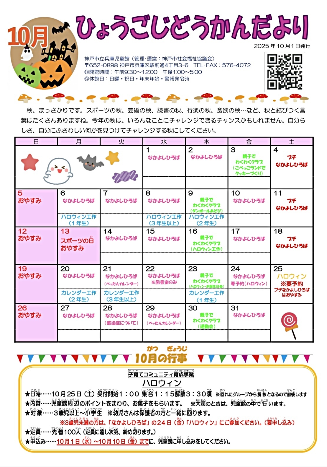 24日ハロウィンイベントは事前申し込み制です。25日はプチなかよしひろばの実施はありません。ご注意ください。