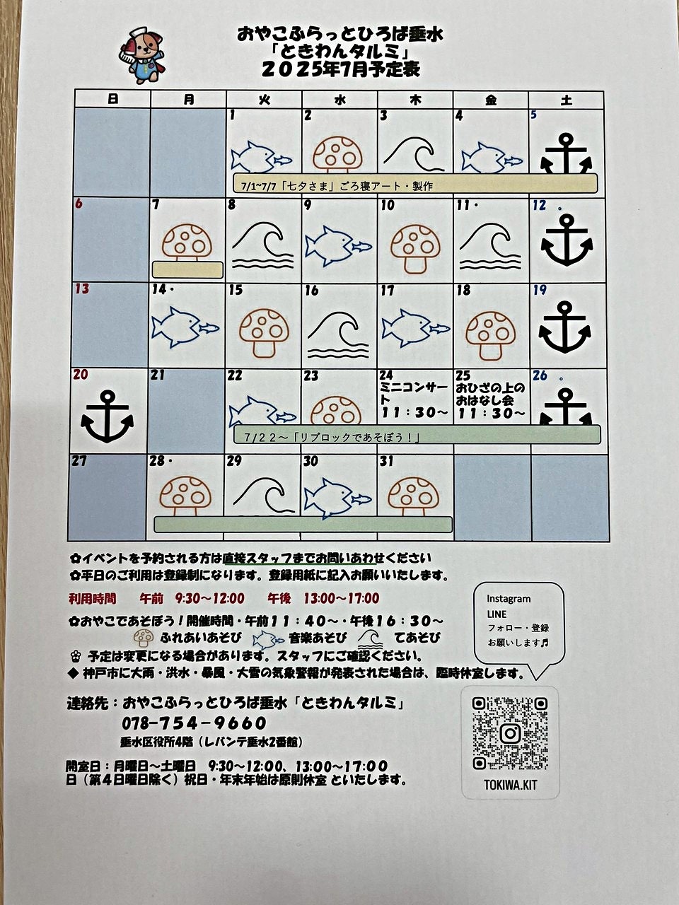 おやこふらっとひろば垂水(ときわんタルミ)7月のカレンダーです