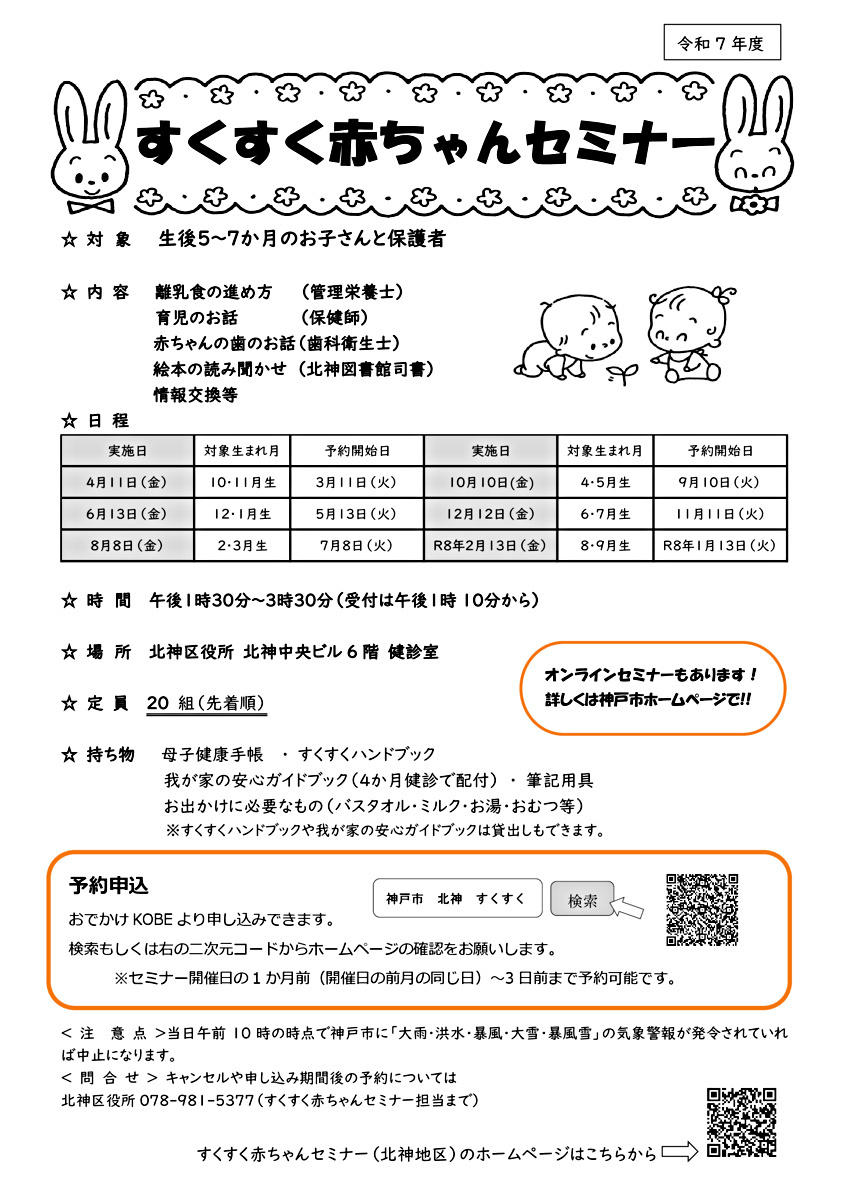 セミナー開催日の1か月前から3日前までネット予約可能です。それ以降の予約やキャンセルについては北神区役所へ電話連絡をお願いします。
