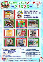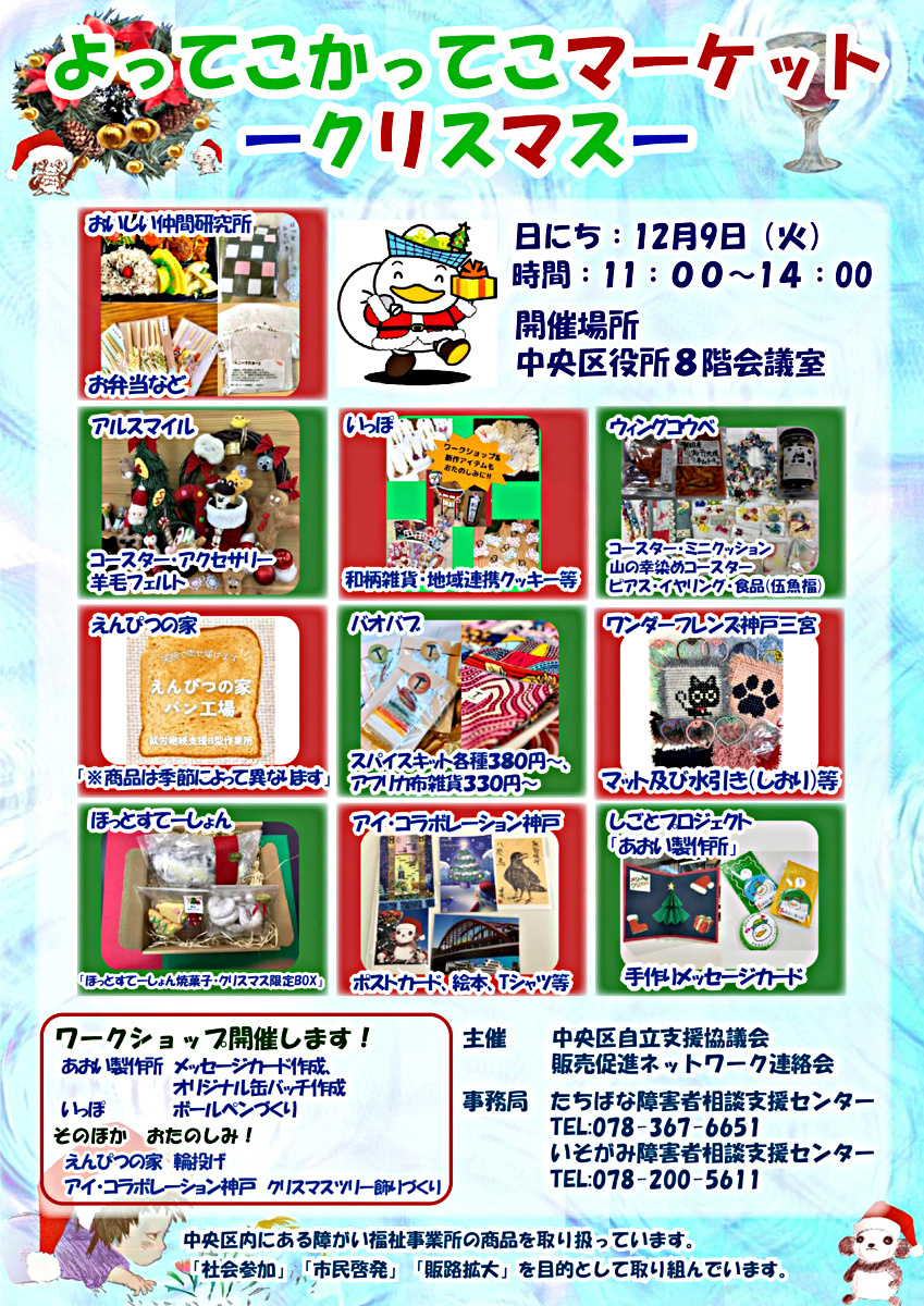 中央区内にある、障がい者福祉事業所の皆さんがまごころ込めて作った布小物やアクセサリーの他、パンやクッキーなどを販売します。クリスマスをテーマにした特別な商品の販売や、ゲーム等の催しもありますのでぜひとも足を運んでみてくださいね。