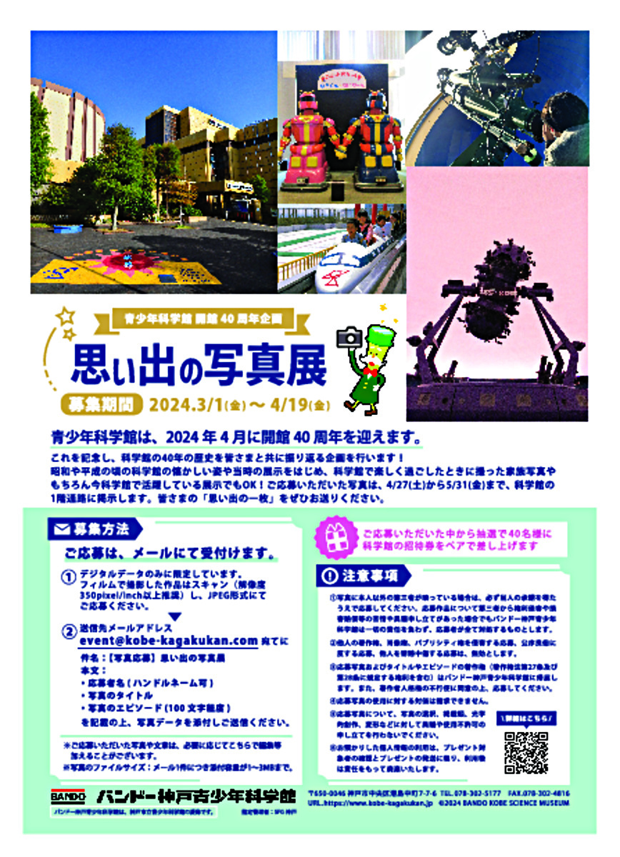 これを記念し、科学館の40年の歴史を皆さまと共に振り返る企画を行います!ぜひ科学館での思い出の写真をお送りください。ご応募いただいた写真は、4/27(土)から5/31(金)まで、青少年科学館の1階通路に掲示します。