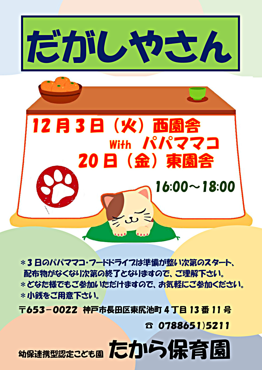 たから保育園名物駄菓子屋さん12月のスケジュールです。3日火曜日はパパママコとのコラボ企画でフードドライブを開催します。20日金曜日は駄菓子屋さんのみの開催となっていますので、ご注意ください。