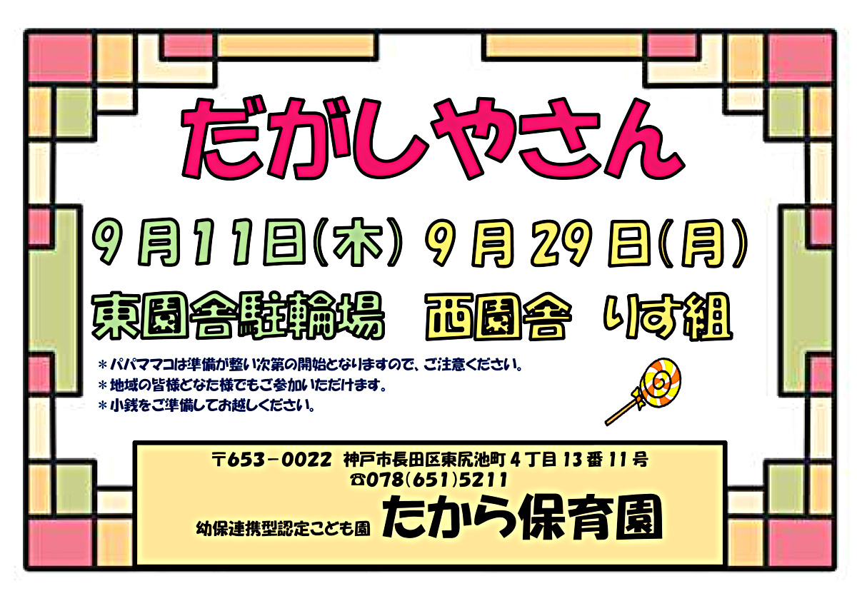 たから保育園名物の駄菓子屋さんが9月は2回開催で行われます。11日は東園舎駐輪場で駄菓子屋さんののみ・29日はパパママコさんとのコラボ開催ですので、皆さんお誘いあわせのうえお越しください。